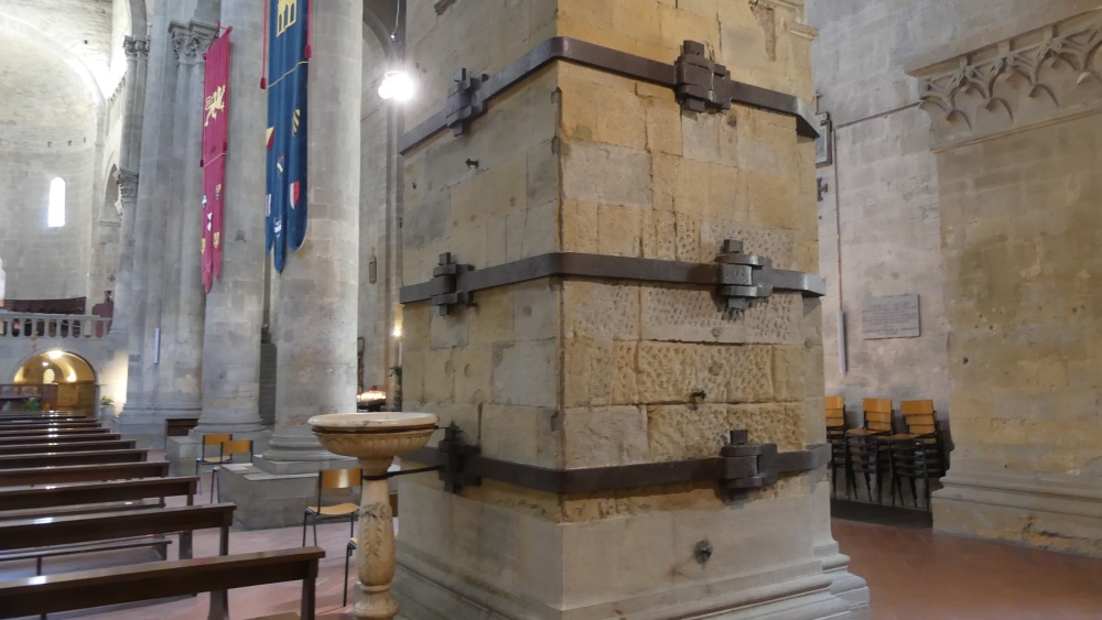 Hinten an der Apsis kann man eine geknickte Säule bewundern, ein typisches Element des romanischen Kirchenbaus. Sie soll das Böse abwehren oder für die Unvollkommenheit des Menschen stehen. Die Apsis weist etwas untypisch zur Piazza Grande, dem städtischen Hauptplatz – siehe Titelbild.