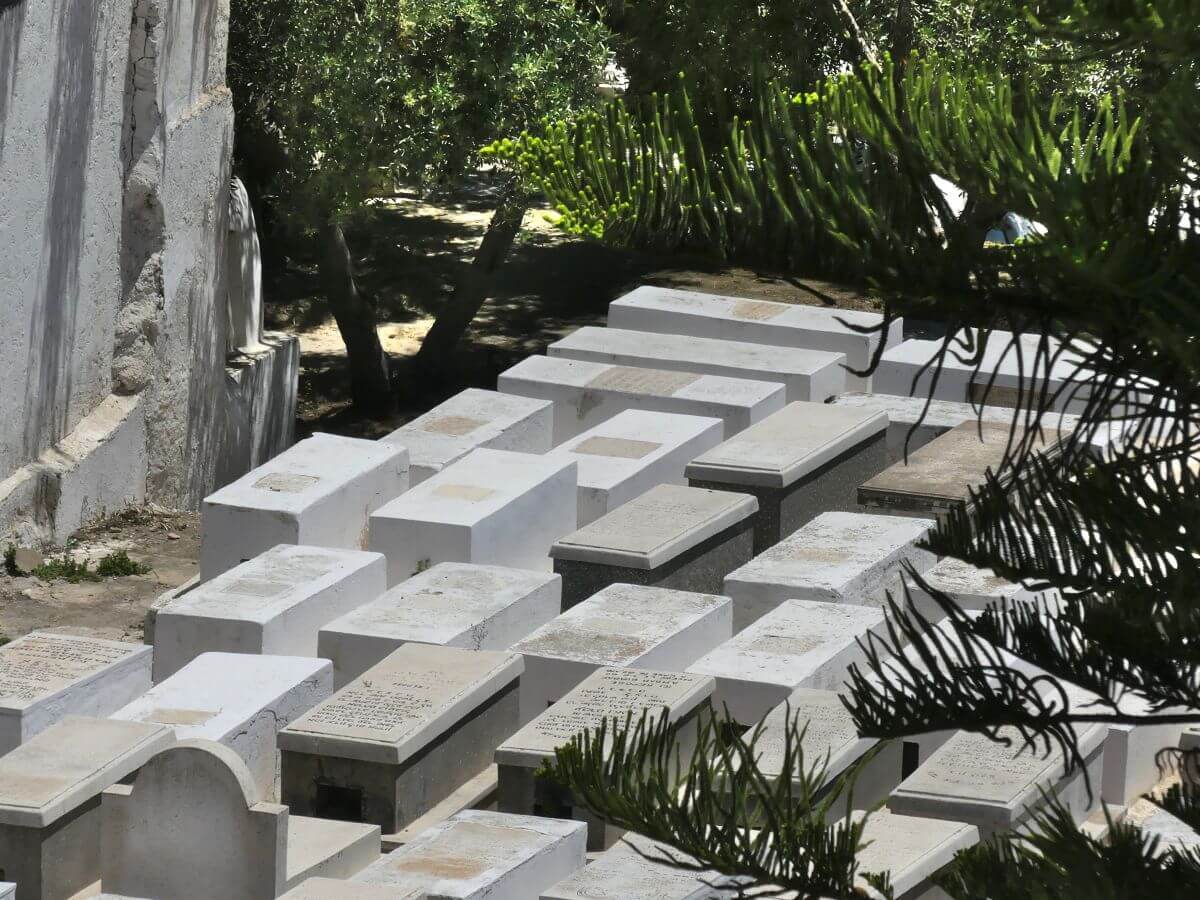Dann dürfen wir noch auf die Dachterrasse steigen, von wo wir einen Blick auf den alten jüdischen Friedhof haben. Eng aneinander gedrängt stehen die steinernen Sarkophage. Wir können sogar die hebräischen Schriftzeichen darauf erkennen.