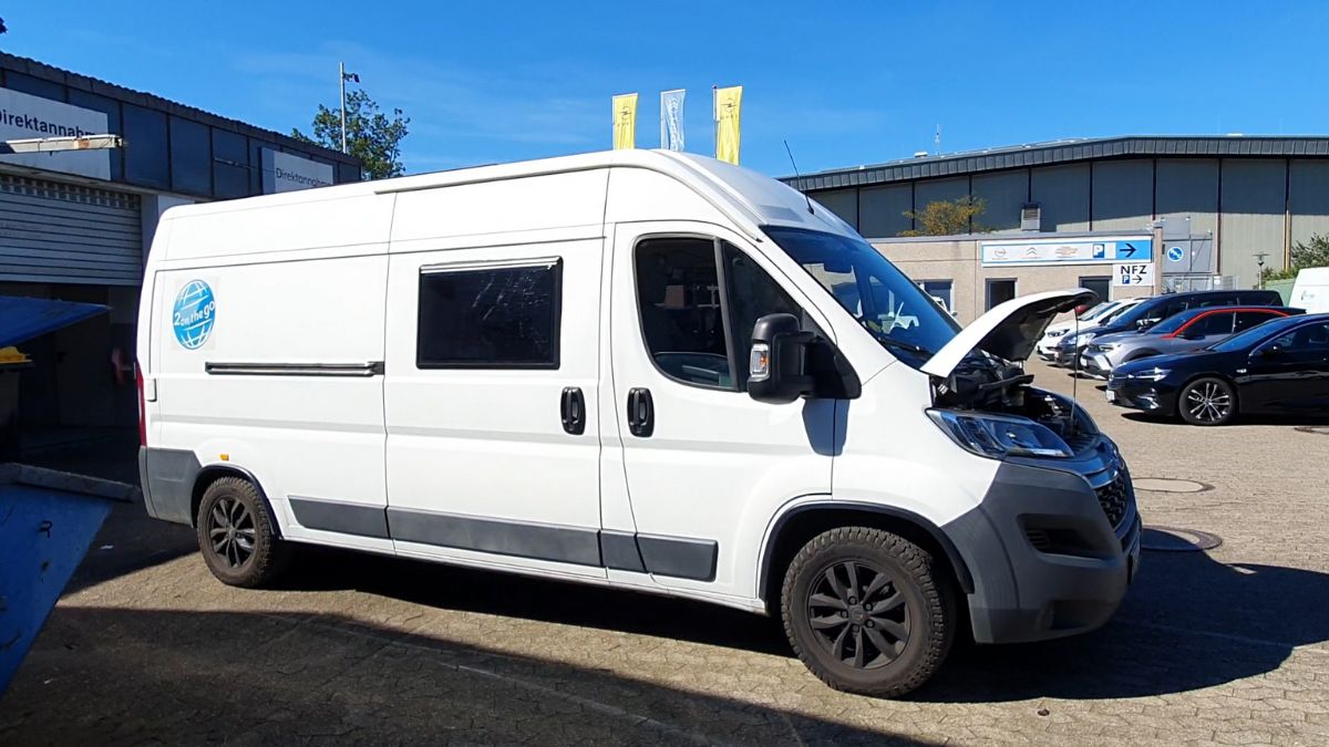 Der Van steht mit geöffneter Motorhaube vor der Werkstatt.