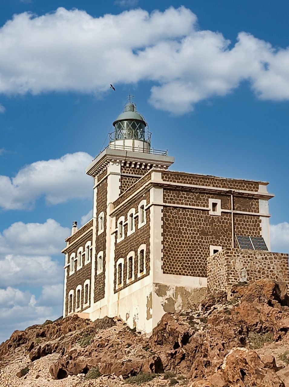 Großes braun-weißes Gebäude, das den Leuchtturm bildet.