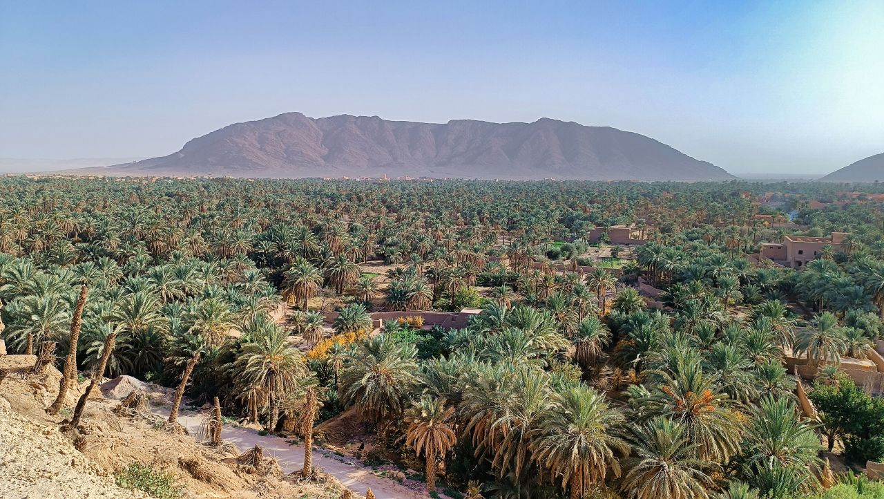 Blick von oben auf ein Tal voller Palmen. Im Hintergrund braune Berge.