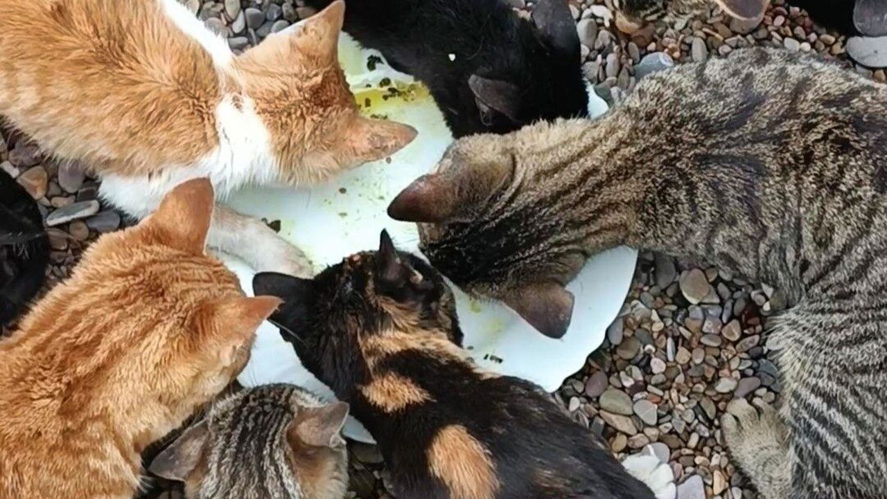 Viele Katzen drängen sich um einen Teller, den sie ablecken.
