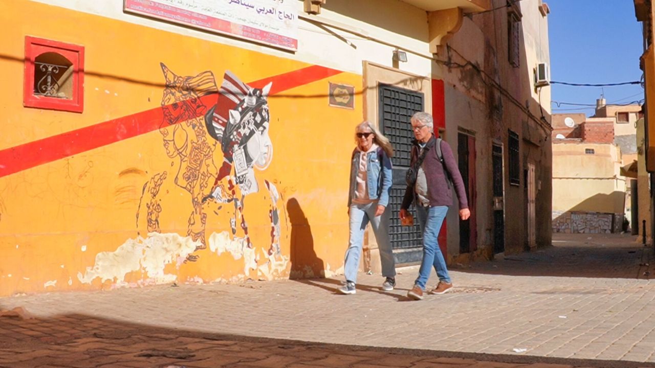 Zwei Menschen gehen unter klarem Himmel an einem farbenfrohen Wandgemälde auf einer orangefarbenen Wand in einer engen Gasse vorbei.