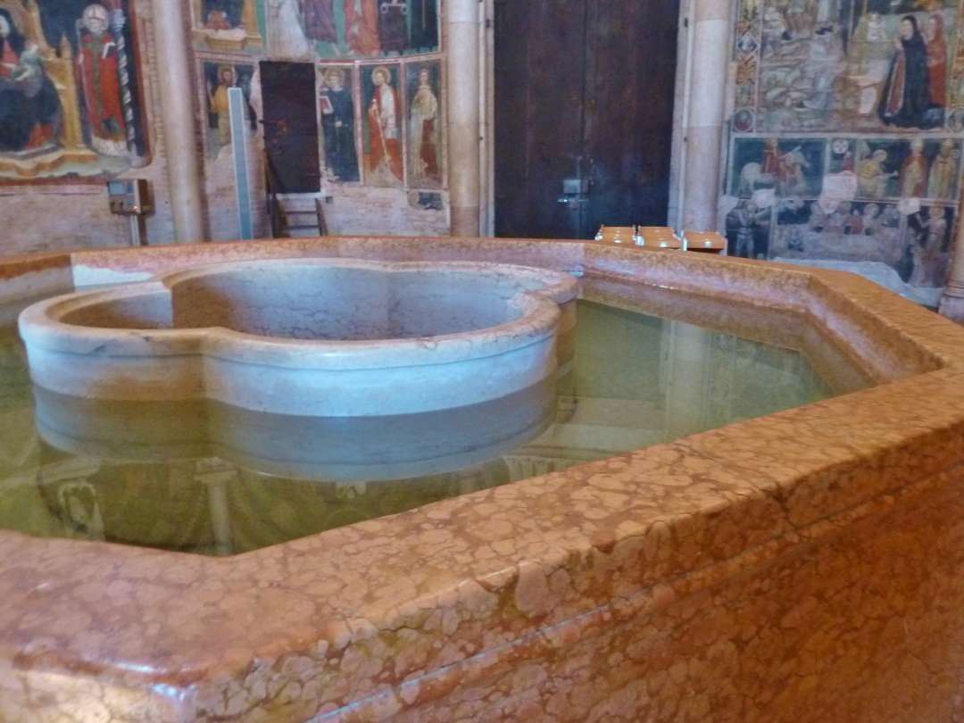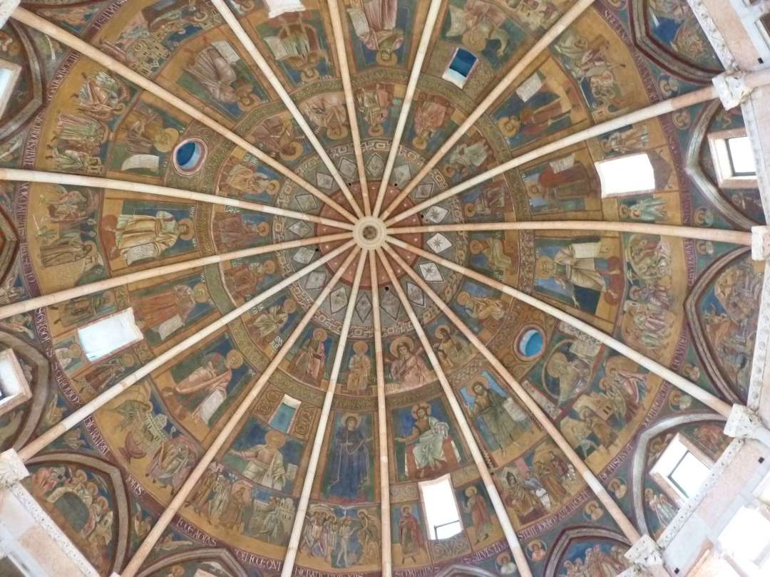 Im Innenraum steht ein großes achteckiges Taufbecken. Hoch oben spannt sich die Kuppel wie ein großer Schirm darüber. Zwischen den 16 Rippen ist ein Reigen von Bildern gemalt. Die Innenwände sind ebenso wie die Außenwände mit Säulengängen geschmückt. Natürlich sind auch die Wände des Baptisteriums mit Fresken bemalt.