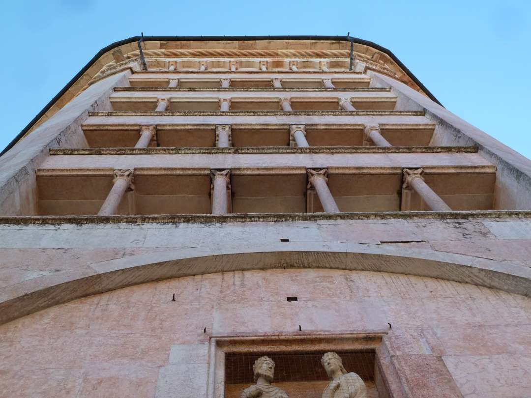 Das zweite Highlight in der Altstadt von Parma ist das achteckige Baptisterium, eine der herausragendsten Sehenswürdigkeiten in Parma. Baptisterien, also Taufkapellen außerhalb der Kirche, blieben in Italien noch lange nach dem Frühchristentum üblich. Diese Taufkirche wurde Ende des 12. Jahrhunderts erbaut und zwar von dem oben erwähnten Herrn Antelami. In zartem Weißrosa schimmert die Fassade aus Veroneser Marmor. Die acht Ecken des Gebäudes werden von Türmchen gekrönt.