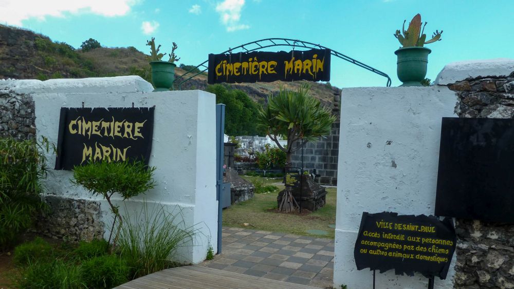Wir fahren runter zur Küste nach Saint-Paul. Dort besichtigen wir den alten Friedhof Cimetière Marin direkt am Meer, auf dem Seehelden, Dichter, wichtige Leute von früher und ein Pirat bestattet sind. Das mit dem Piraten ist aber wahrscheinlich Unfug. Der wurde nämlich schon 50 Jahre bevor der Friedhof eröffnet wurde enthauptet und es war gute alte Sitte, dass sündige Piraten überhaupt nicht bestattet wurden. Aber hier bringt alle paar Jahre mal ein Zyklon alles durcheinander, zum Beispiel auch Grabsteine und da kann es beim Aufräumen ja mal zu Missverständnissen kommen…