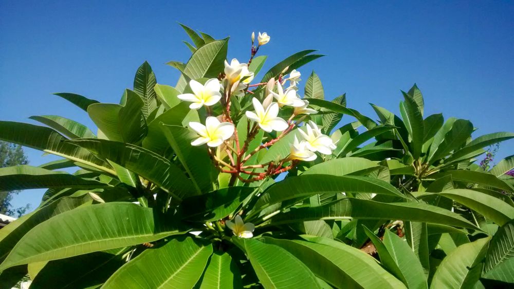 Frangipany-Baum im Garten unserer Unterkunft auf Reunion
