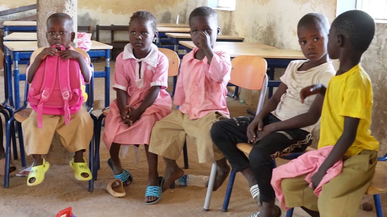 Fünf Kinder sitzen auf Stühlen in einem Klassenzimmer. Einige tragen rosa Uniformen. Ein Kind hält einen rosa Rucksack. Das Klassenzimmer ist schlicht eingerichtet.