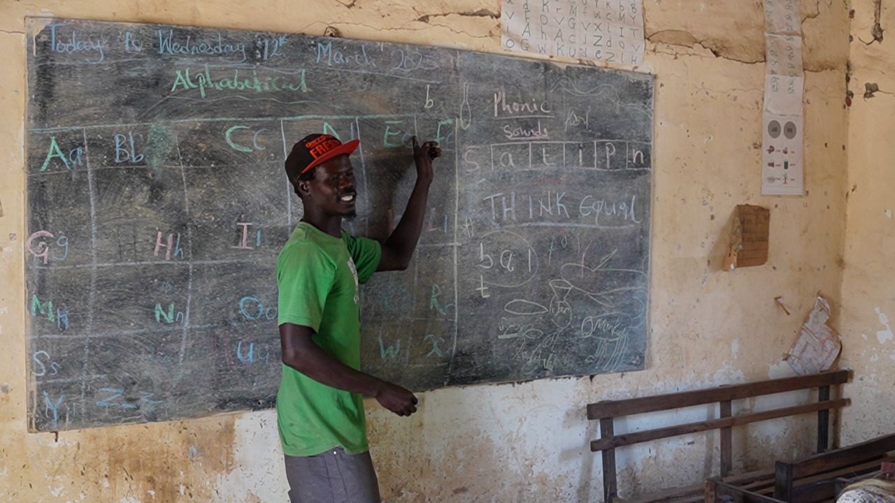 Ein Mann in einem grünen Hemd steht neben einer mit Buchstaben, Wörtern und Zeichnungen bedeckten Tafel in einem Klassenzimmer mit abgenutzten Wänden und leeren Holzbänken.
