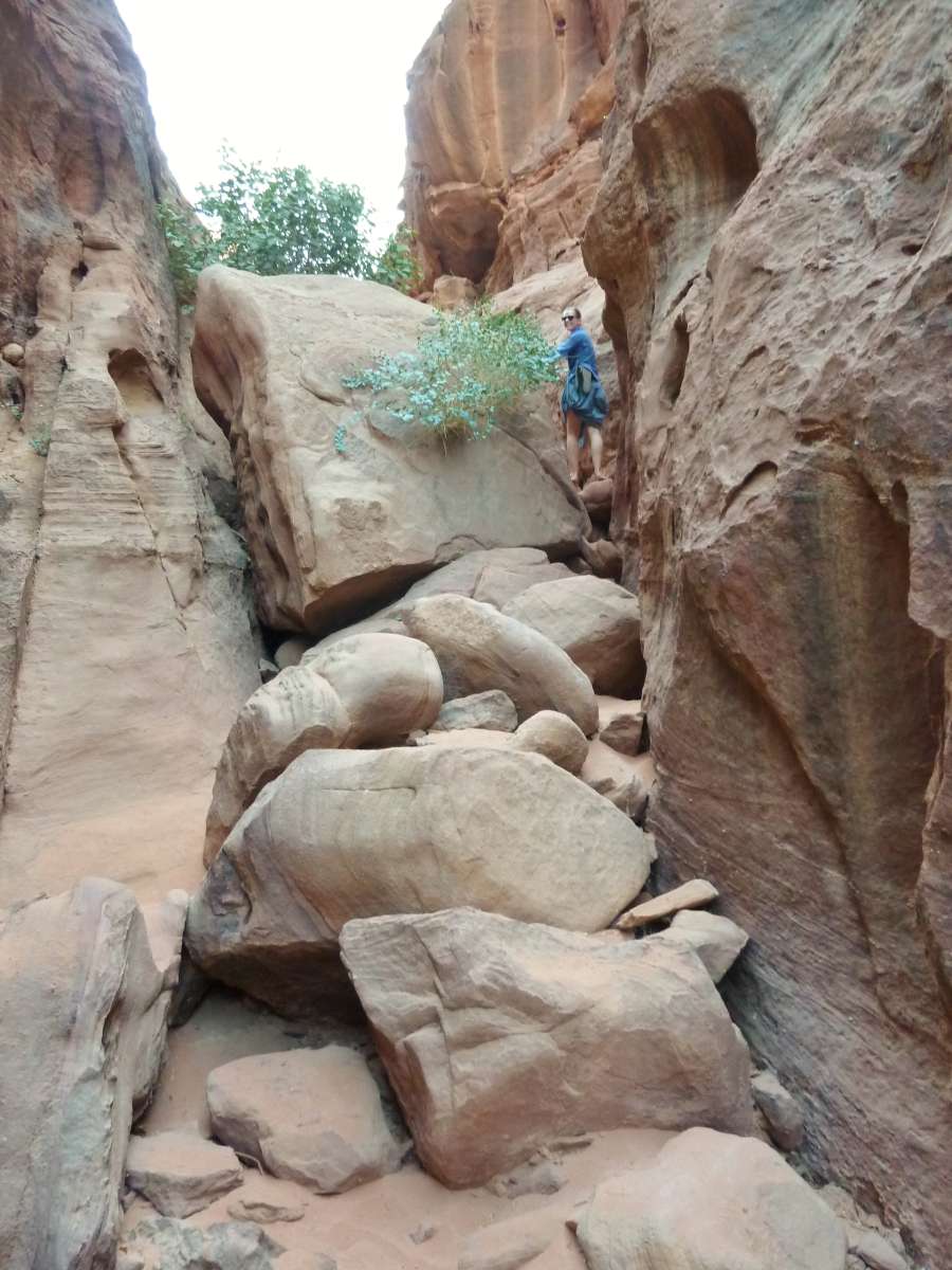 Plötzlich stehen wir vor einem riesigen Felssturz, der den Canyon versperrt. Wir trauen unseren Augen nicht. Gewaltige Felsblöcke türmen sich meterhoch übereinander. Nur Sand? Für einen Moment zweifeln wir, ob wir den richtigen Weg gefunden haben. Gehen sogar noch mal ein Stück zurück, um zu sehen, ob wir irgendwo einen Abzweig verpasst haben. Doch die steilen Wände lassen keinen Ausweg zu.